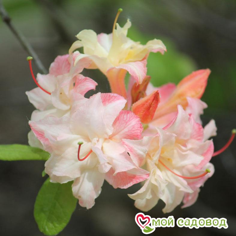 Листопадная азалия с оригинальной игрой красок! Цветки махровые (9-12 волнистых лепестков), с переливчатыми оттенками — светло-жёлтыми, кремово-жёлтыми, розово-жёлтыми и отчасти красновато-жёлтыми. Соцветия высотой 6 см, шириной 9 см, состоят из 5-7 цветков диаметром 5 см. Цветение позднее, с середины июня. Куст вертикальный и широкий, к 10-ти годам высота и ширина 180 см.